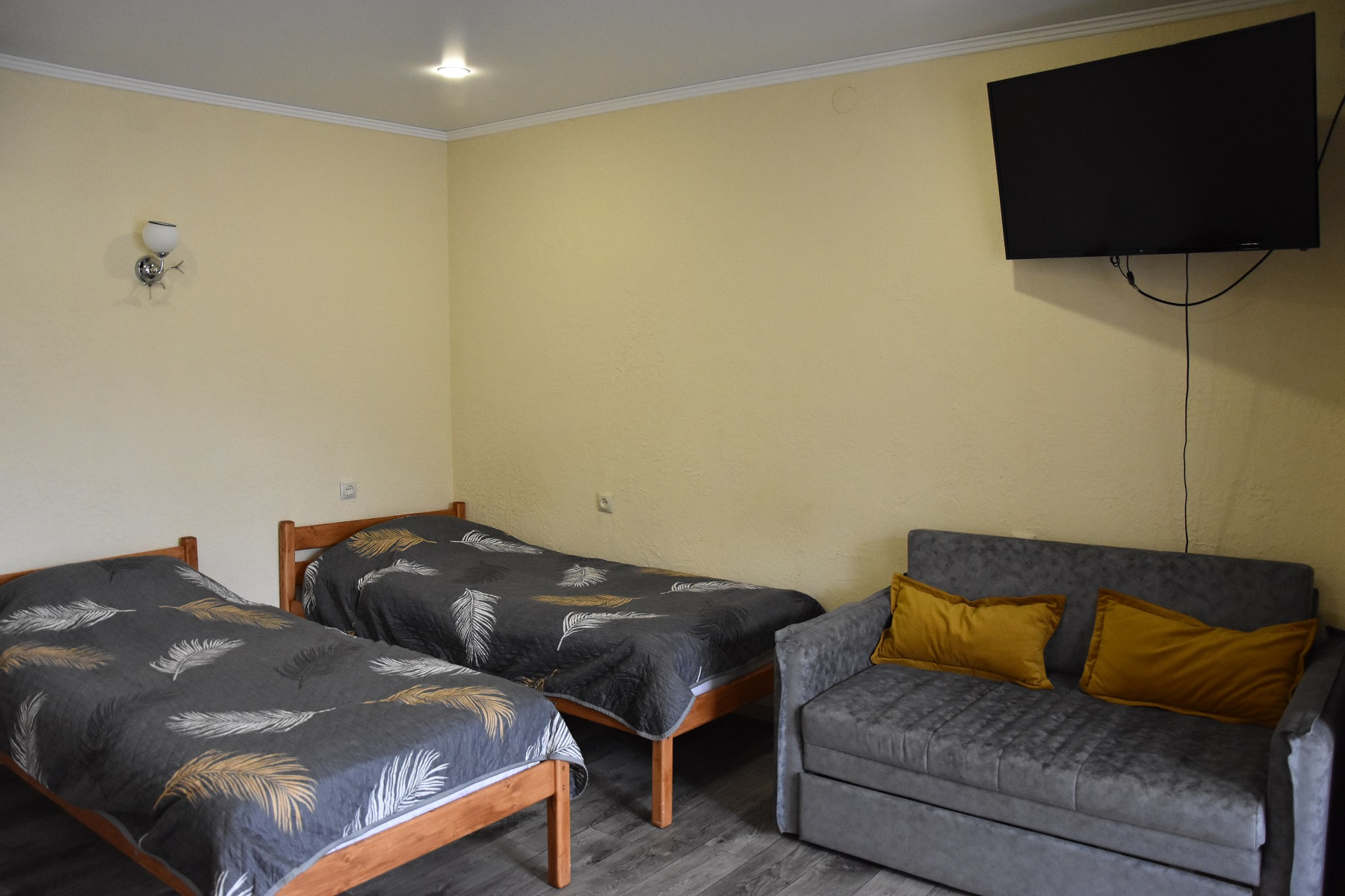 В комнате имеется: 2 отдельно стоящие кровати с ортопедическими матрасами и чистыми комплектами постельного белья; 1 раскладной диван на двух человек с чистым комплектом постельного белья. При необходимости можно разместить пятого гостя на раскладушке за дополнительную плату;